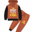 Heartwarming orange and black tracksuit set for boys featuring 'Daddy Will Always Be My King' design with golden crown. Includes hooded sweatshirt with black contrast sleeves and front pocket, plus matching orange joggers with black cuffs and 'King' text on leg. Warm fleece material perfect for winter. A sweet outfit that celebrates the special bond between father and son. Perfect gift for daddy's little prince
