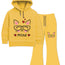 Adorable yellow tracksuit set for girls featuring cute cat face with glasses and 'Meow' text surrounded by hearts. Includes soft fleece hoodie with hood, drawstrings, and front pocket, plus matching flare pants with cat graphic on leg. Warm and comfortable material perfect for winter. Your little cat lover will adore this sweet and playful outfit! Perfect for girls who love cats and fun fashion