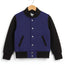 Classic varsity bomber jacket for kids featuring blue body with black sleeves and colorful striped trim on collar and cuffs. Includes snap button front closure and front pockets. Made from soft fleece material perfect for winter. This stylish jacket combines retro athletic style with modern comfort, ideal for casual wear or school. Available for both boys and girls. Keep your little one warm and looking cool this season!
